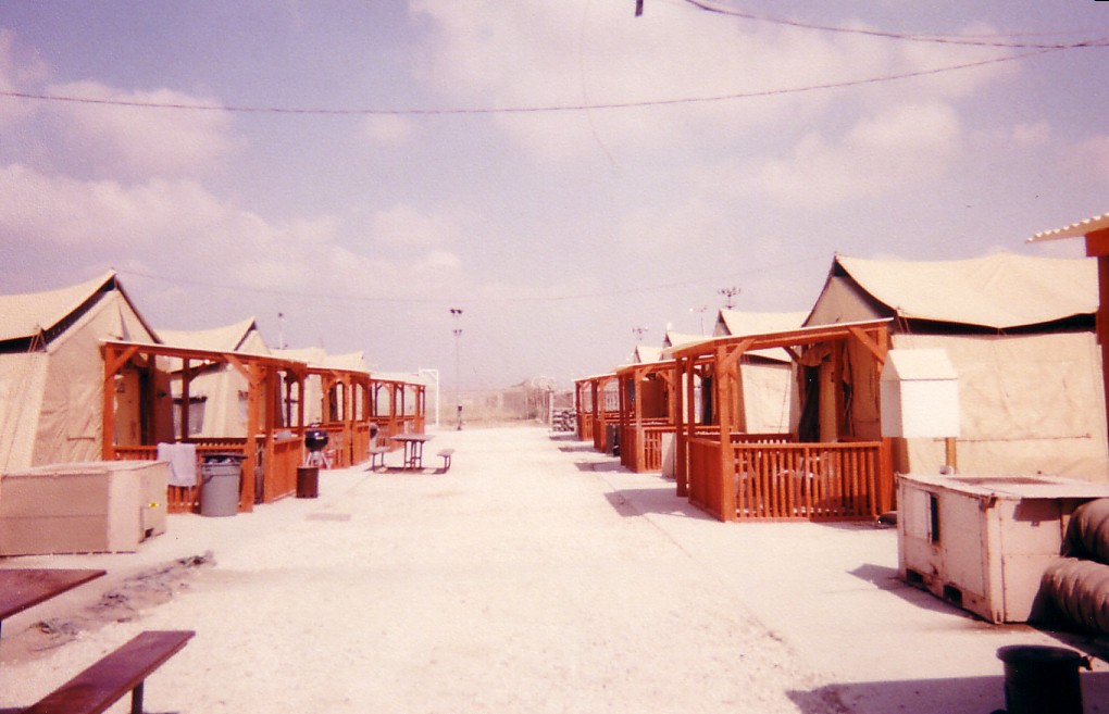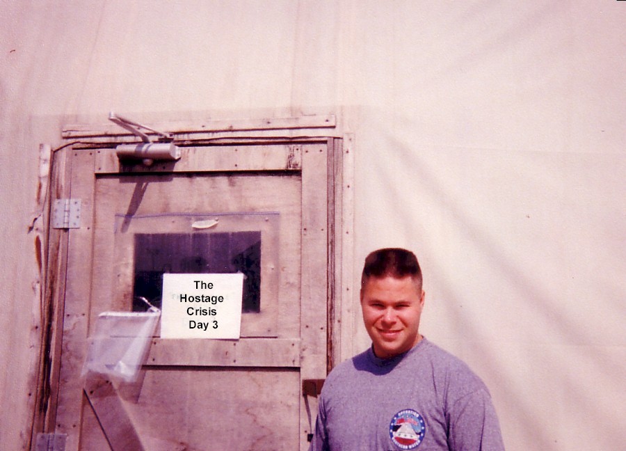 The Hostage Crisis, Day 3. This is outside our "hangar" living accommodations. It was loud enough with the airplanes outside but sleeping with 100 of my best buds in one room..... |